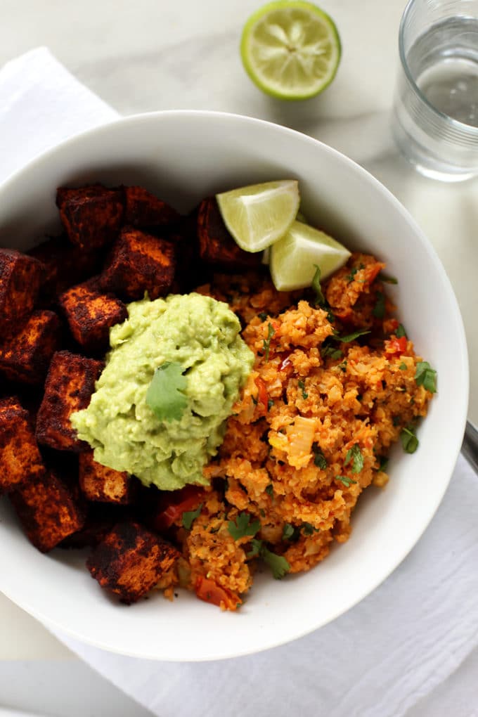 Spicy Cauliflower Rice, Cinnamon-Paprika Sweet Potatoes & Avocado Mash