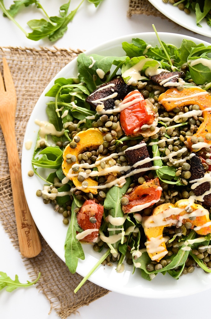 This vegan french lentil & roasted vegetable salad with creamy tahini dressing has four delectable layers. AÂ bed of baby arugula is topped with protein-packed french lentils, roasted delicata squash and other savory veggies are strewn about the greens, and the most delightfully creamy tahini dressing is drizzled over top.Â