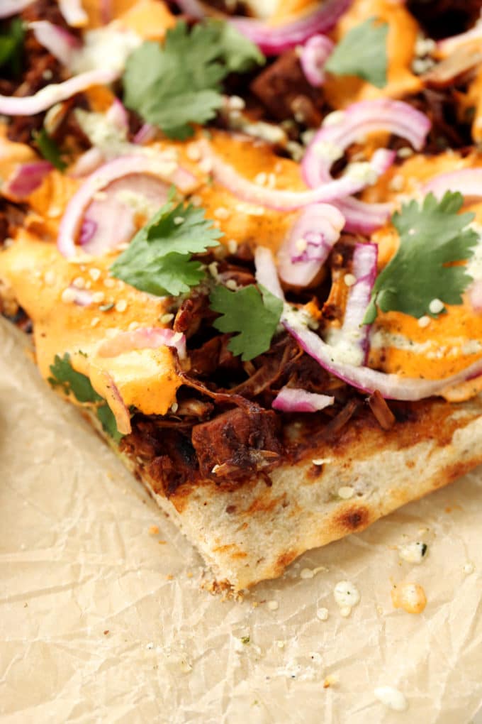 This grilled vegan BBQ jackfruit pizza with hemp seed cheddar was designed with summer in mind. Grilled pizza is topped with BBQ pulled jackfruit, tangy hemp seed cheddar cheese, zesty hemp seed ranch, red onions, and fresh cilantro.