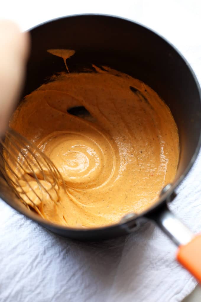 While the BBQ jackfruit is simmering, make the hemp seed ranch by adding all ingredients to a blender and blending until smooth. This ranch is creamy, tangy, and subtly zesty. Its acidity complements the other flavors of the pizza and offers balance and brightness. Next, you'll make the hemp seed cheddar by adding all ingredients to a blender, blending until smooth, and whisking over medium heat until thickened. It might sound complicated to make your own cheese, but it's surprisingly simple and comes together in under 10 minutes.