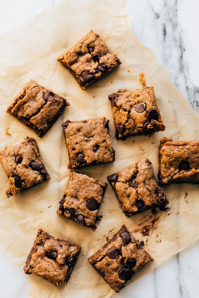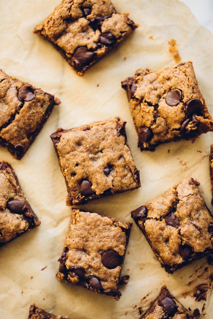 These are your gooey, chocolatey, messy, eat 'em up almond butter oatmeal chocolate chip cookie bars. They've got the crowd appeal, texture, and taste of a wildly decadent cookie bar, yet they're packin' fiber and whole grains like nobody's business. They're also free of refined sugar, gluten, and oil. And they've got chocolate chips tucked away in just about every nook and cranny.