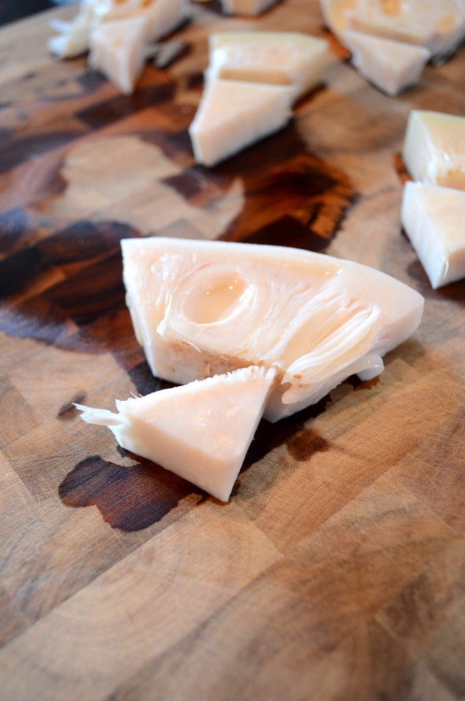 First order of business: Sauté a small onion in a bit of olive oil. While the onion sweats and softens, drain a can of young green jackfruit (in water or brine) and prepare it by cutting off the triangular tips like so. If you're not able to find jackfruit, you can use two cans drained heart of palm instead and skip the cutting step altogether.