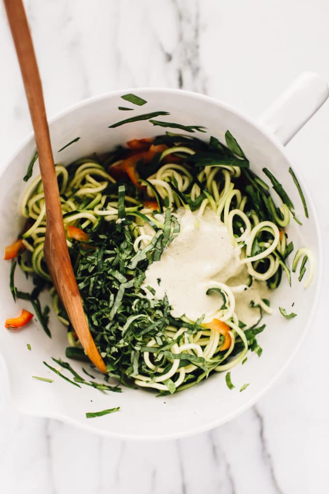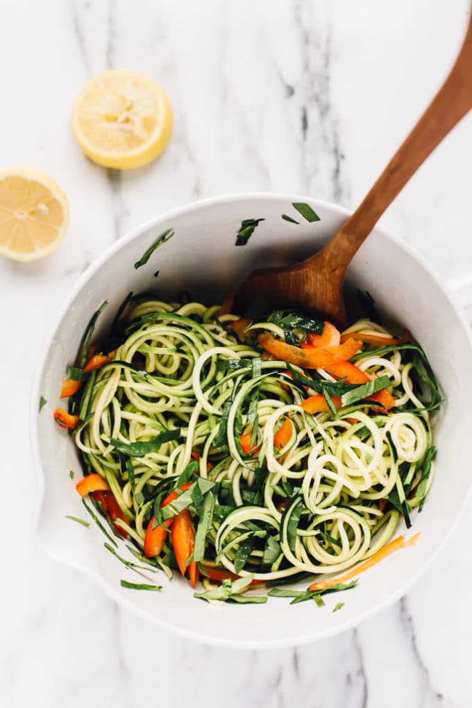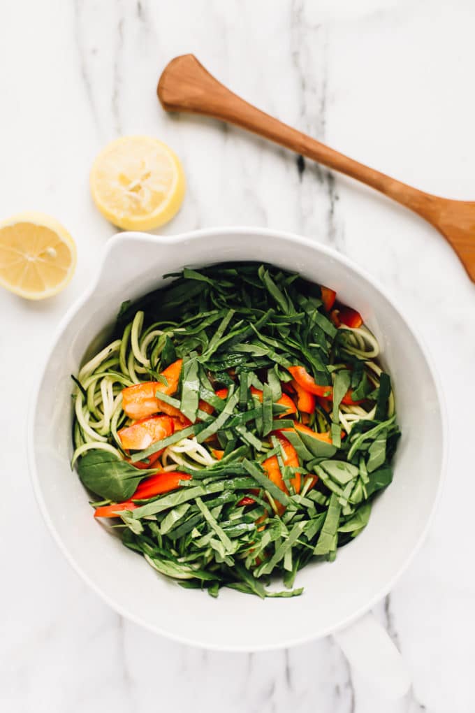 - Add the zucchini noodles, red bell pepper, and spinach to a large mixing bowl. Pour the lemon juice over the noodles and veggies and toss to coat. Let the noodles marinate for 10 minutes.
