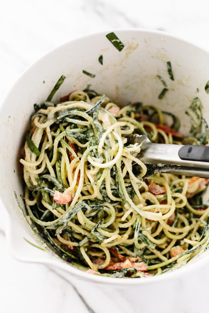 - Add the basil and pour as much of the Alfredo sauce as desired over the zucchini pasta. Toss to coat. Taste and season with sea salt and black pepper, to taste. If desired, sprinkle on a bit of vegan parmesan cheese*.