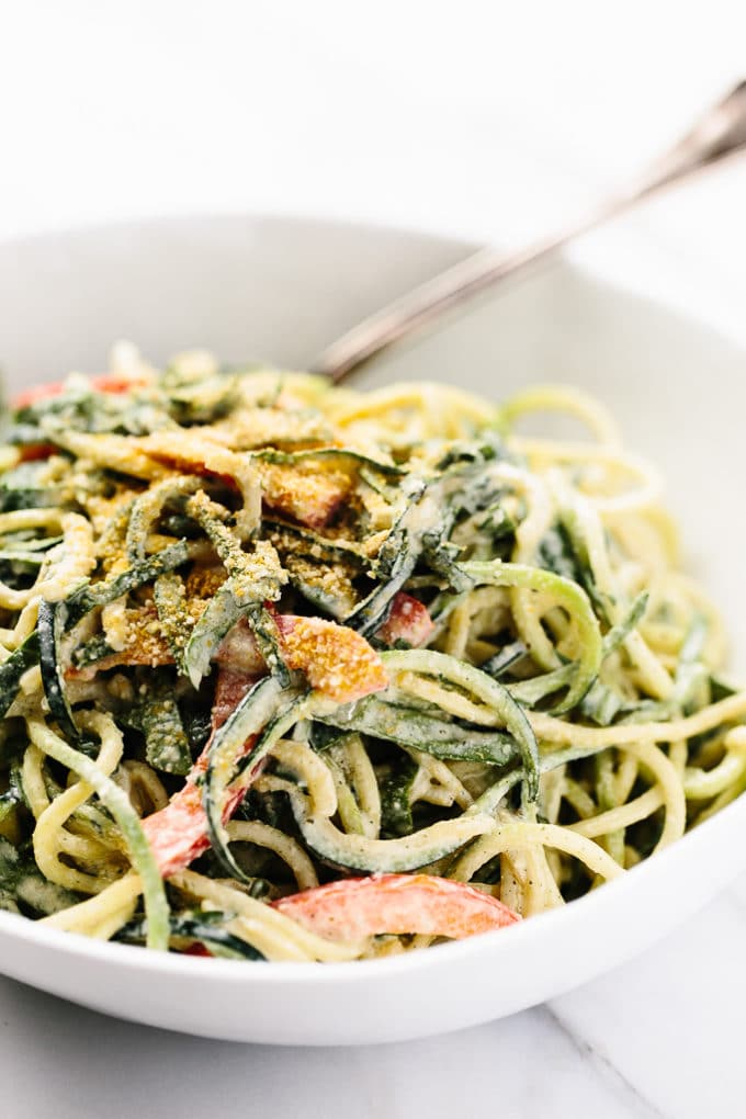 Nestle heaps of the zucchini pasta into bowls and sprinkle with a bit of vegan parmesan cheese, if you'd like. Then, sink a fork in and get twirling.