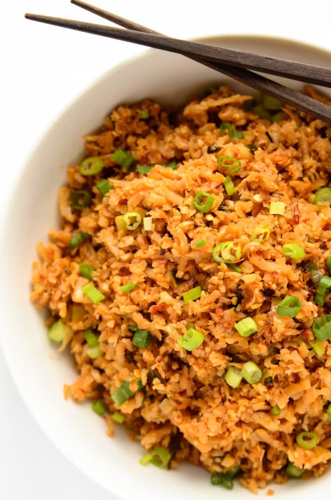 This flavorful vegan, grain-free chili-garlic cauliflower fried rice requires just 7 ingredients and 30 minutes of time. Riced cauliflower and sliced scallions are pan-fried in coconut oil until golden and lightly caramelized. Then, a tangy, salty, and spicy glaze of tamari or soy sauce, rice vinegar, sesame oil, and chili-garlic sauce is added to the pan to finish the dish.