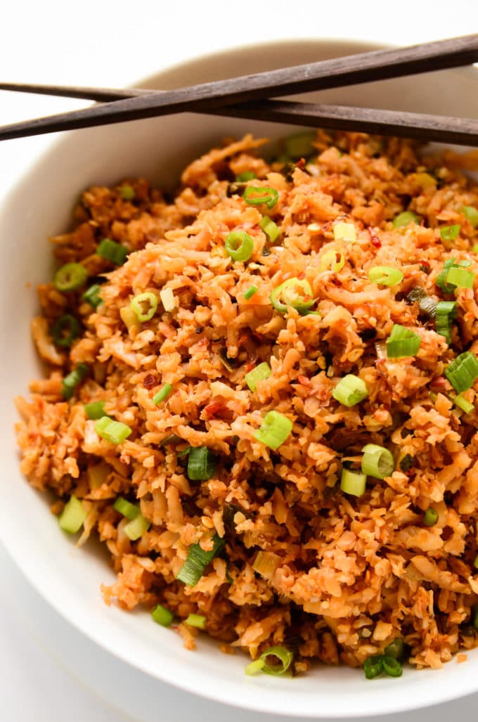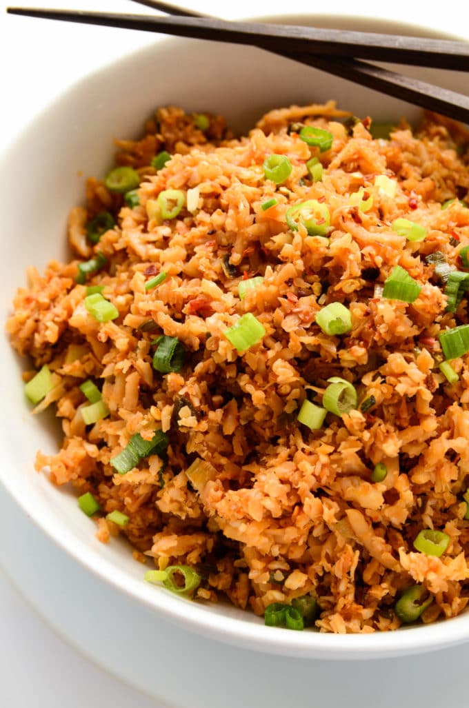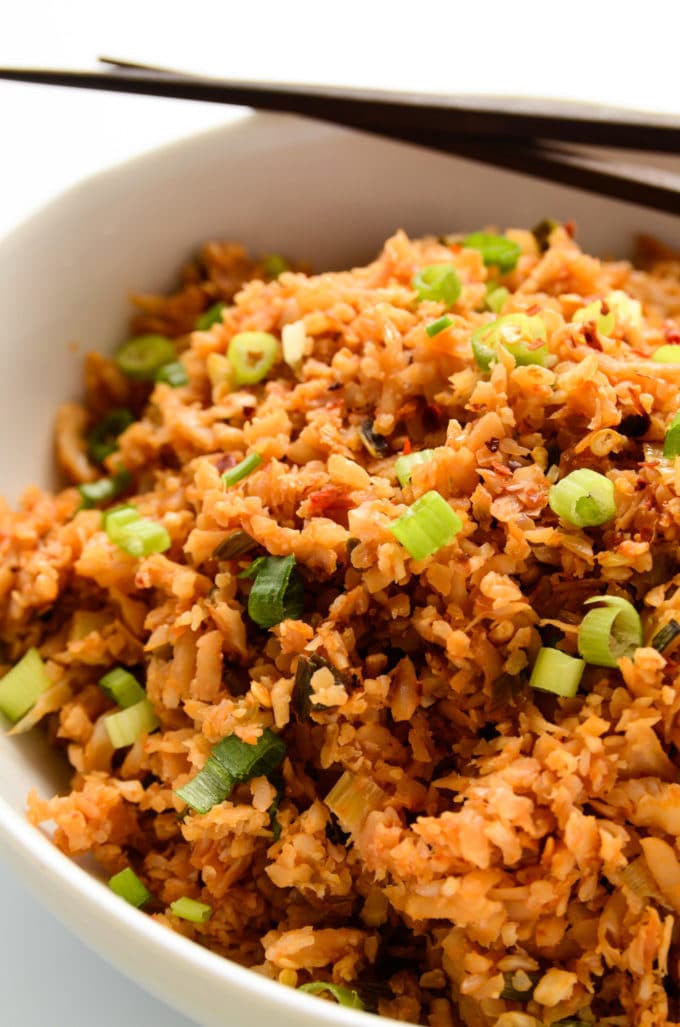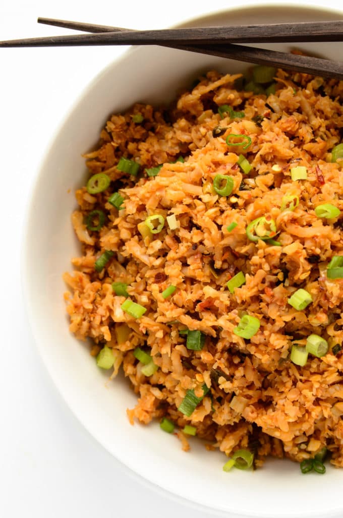 This flavorful vegan, grain-free chili-garlic cauliflower fried "rice" requires just 7 ingredients and 30 minutes of time. Riced cauliflower and sliced scallions are pan-fried in coconut oil until golden and lightly caramelized. Then, a tangy, salty, and spicy glaze of tamari or soy sauce, rice vinegar, sesame oil, and chili-garlic sauce is added to the pan to finish the dish.