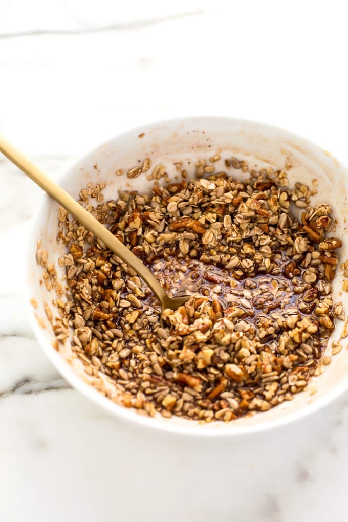 Prepare the sunflower-pecan crumble while the potatoes bake. In a bowl, whisk together chopped pecans, raw sunflower seeds, oats, cinnamon, sea salt, and a dash of nutmeg. Then, add some melted coconut oil, maple syrup, and vanilla. Give it a quick stir, and it's good to go.