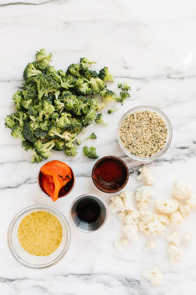 - Add the boiled cauliflower florets, remaining 1 cup of vegetable broth, Hemp Hearts, roasted red peppers, nutritional yeast, arrowroot powder, apple cider vinegar, and remaining 1 teaspoon of sea salt to a high-speed blender. Blend on high for 2 minutes or until completely smooth and creamy.
