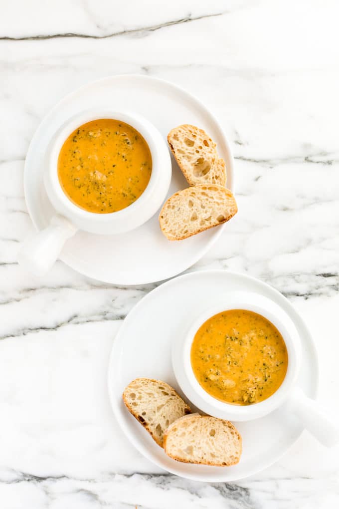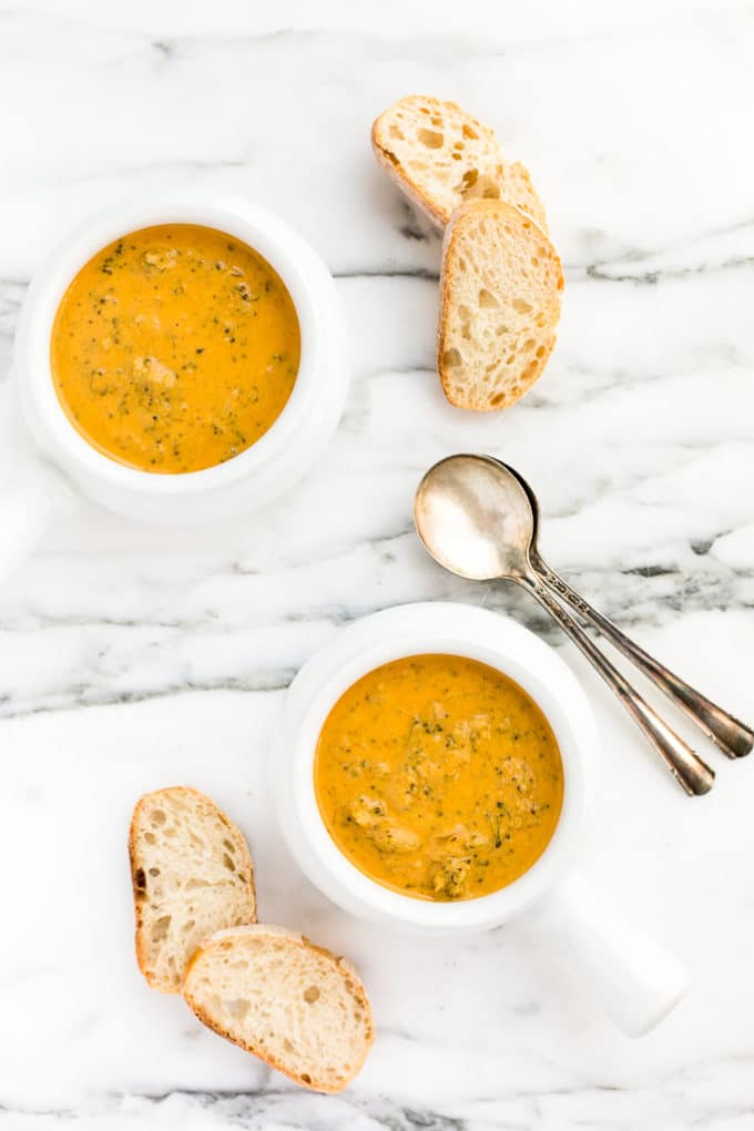 This is truly the best ever vegan creamy broccoli cheese soup. Honest to goodness. It's one of my all-time favorite recipes ever, and it's won the praises of vegans and non-vegans alike. It's made with all pure, whole foods, plant-powered ingredients, yet it's just as savory, luxuriously creamy, buttery, salty, cheddar-y, and cheesy as the "original". Seriously, we're talking Panera-level delicious.