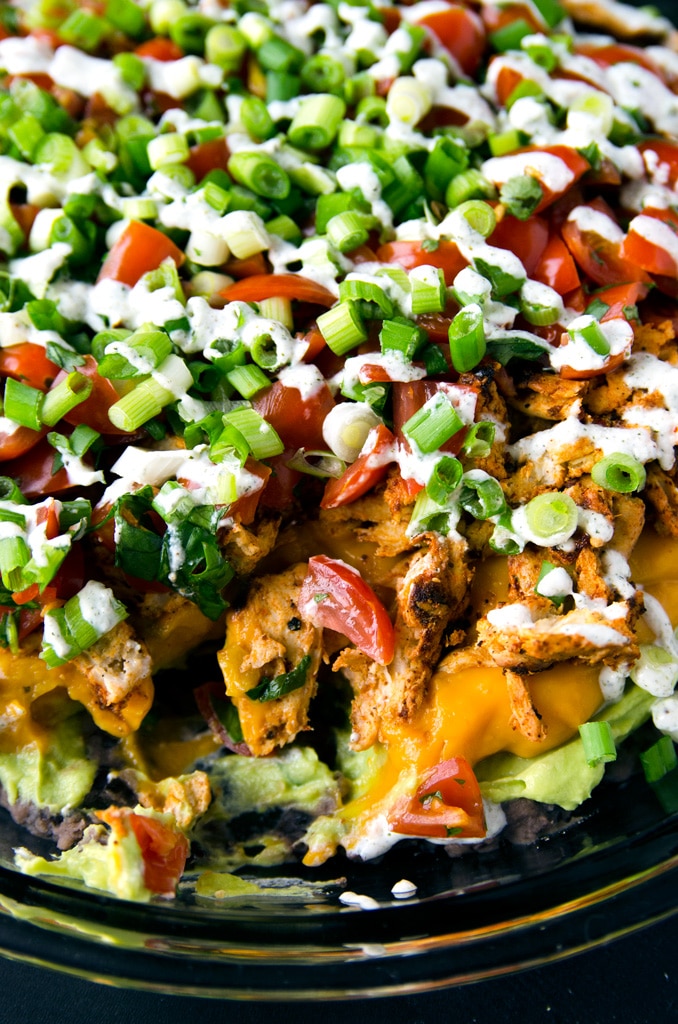 The second layer is an avocado mayo, which is just avocado, a splash of lime juice, a clove of garlic, and a pinch of salt that's been processed into a smooth cream in a food processor. The third layer is this sweet potato nacho cheese, which is brightly-hued, plant-based, and packed with Vitamin A thanks to the steamed sweet potatoes. The fourth layer is the seasoned and shredded chick'n. The fifth layer is a quick and easy pico de gallo that you'll make by combining quartered cherry tomatoes, cilantro, and sea salt. The sixth layer is a quick sprinkling of sliced scallions. And the seventh and final layer is a drizzle of hemp seed sour cream that packs a kick of omega-3, omega-6, and complete protein.