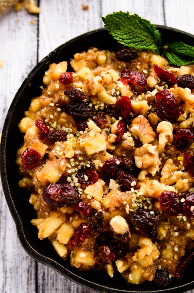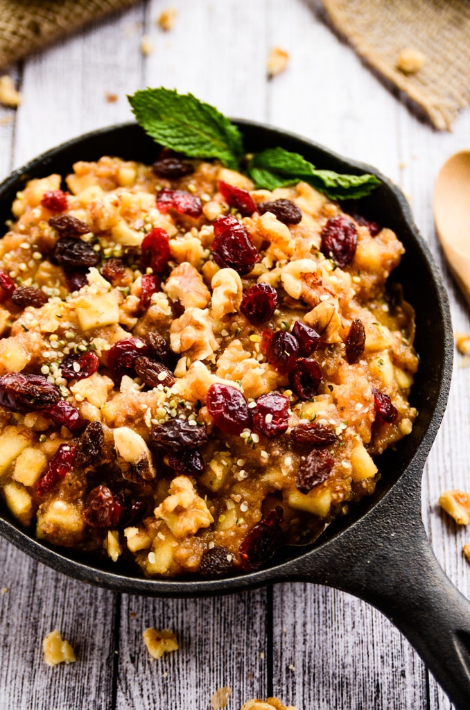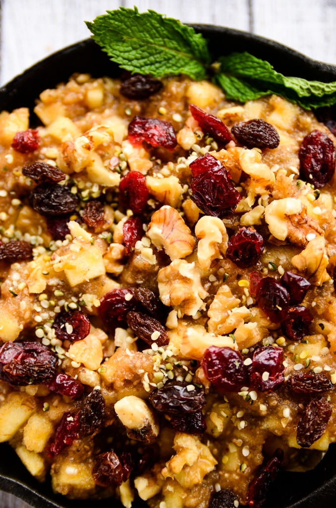 Although this dish looks like a big bowl of oatmeal, there isn't an oat or a grain in sight. Honeycrisp apples, medjool dates, cinnamon, and nutmeg are tossed into a food processor and whirled to sweet perfection. Then, another honeycrisp apple is finely diced and stirred into the apple-date mixture along with two tablespoons of chia seeds. After chilling in the refrigerator for at least one hour (or overnight), the apple-cinnamon deliciousness is scooped into two bowls and topped with raw walnuts, raisins, dried cranberries, and hemp seeds.