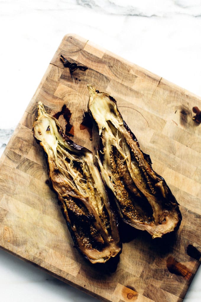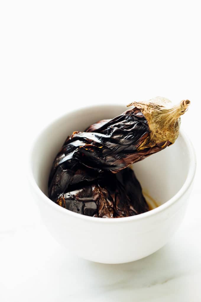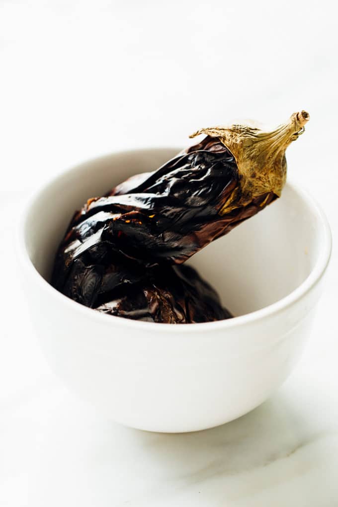 Once the eggplant is thoroughly charred and ultra tender, you'll plop it in a bowl to let it cool and steam itself a bit more.