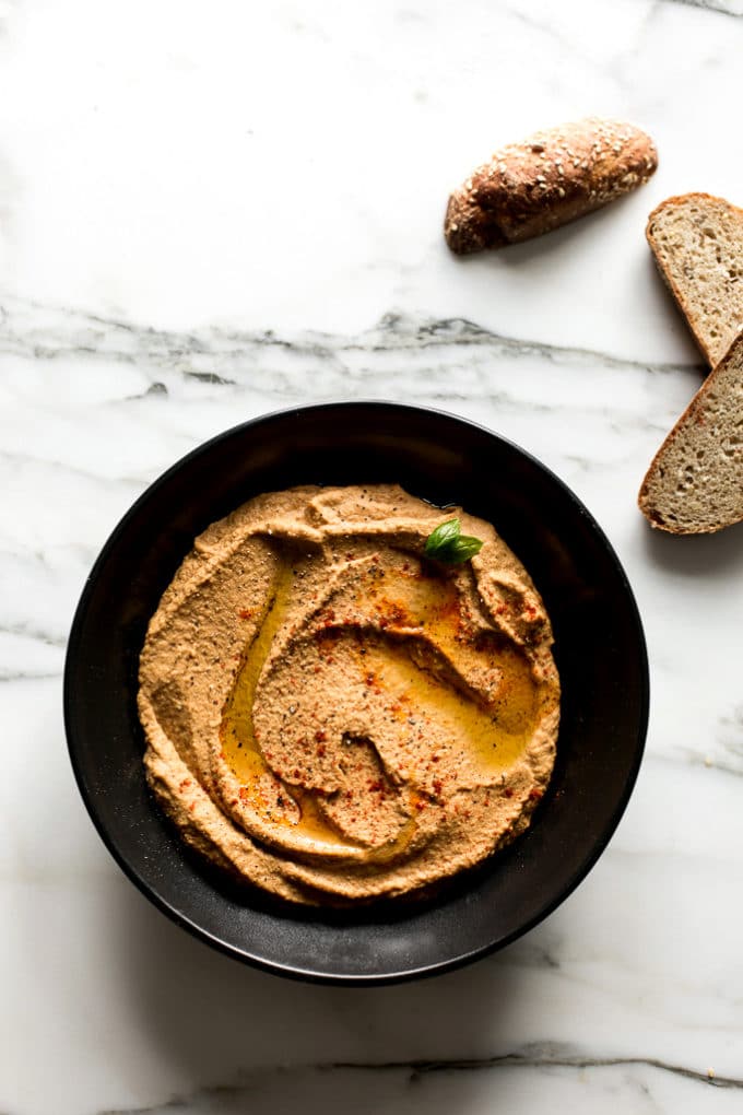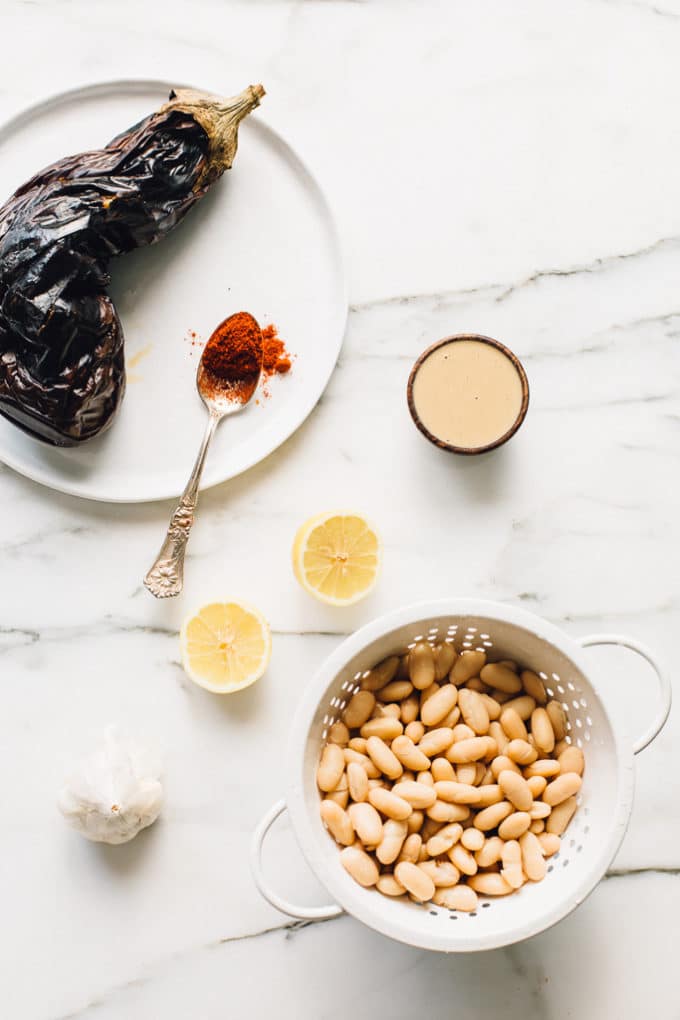You'll add the eggplant to a food processor along with cannellini beans, tahini, lemon juice, smoked paprika, garlic, and sea salt. Then, process until quite smooth and creamy. Scoop it into a dish, garnish as desired, and serve it up alongside seeded bread, pita chips, veggies, tortilla chips, warm naan, etc.