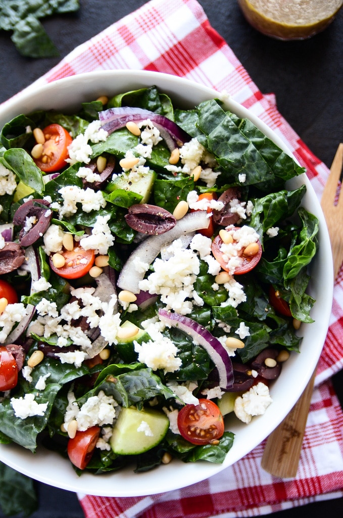 - Add the kale, cherry tomatoes, cucumber, red onion, olives, and pine nuts to a large bowl. Pour the dressing (see recipe below) over top, toss to coat, and divide the salad between two serving bowls.
