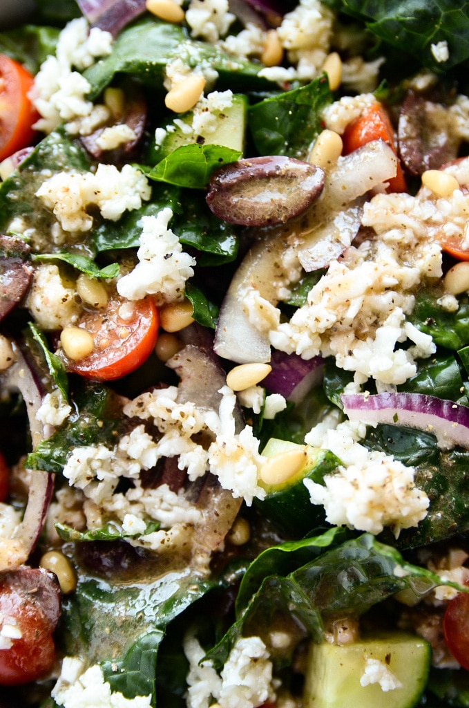 This vegan detoxifying Greek salad with kale & cauliflower feta packs some major nutritional oomph. Chopped dino kale, cherry tomatoes, cucumbers, red onion, kalamata olives, and pine nuts are tossed in a tangy vinaigrette and topped with "feta" cheese. The "feta" is made by grating cauliflower and marinating it in a mixture of olive oil, lemon juice, and salt. The result lends a salty-tangy flavor that is comparable to feta cheese yet light and detoxifying.