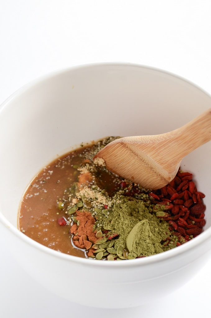 - Add the rolled oats, buckwheat groats, pumpkin seeds, hemp seeds, matcha powder, ginger, cinnamon, and sea salt to a large bowl.