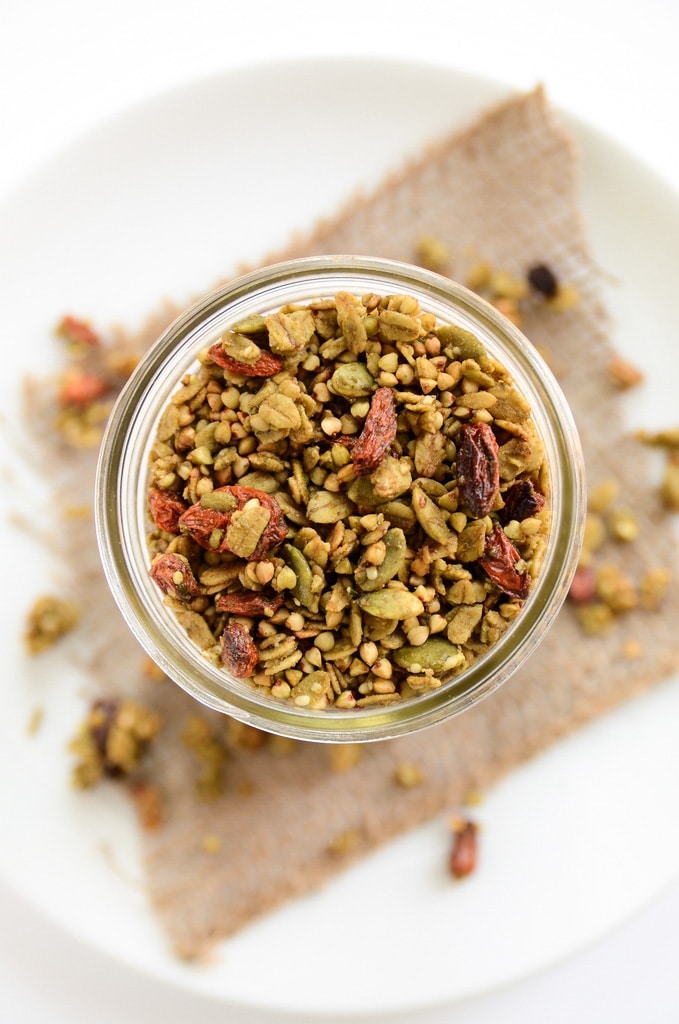 This flavorful vegan, gluten-free matcha green tea, buckwheat & goji granola comes together in a speedy 25 minutes flat. Rolled oats, buckwheat groats, pepitas, hemp seeds, matcha powder, ground ginger, cinnamon, and a pinch of sea salt are coated in a sweet glaze of maple syrup, coconut oil, tahini, and vanilla. The mixture is then spread out on a pan and baked to crispy perfection. Goji berries are mixed in after baking to lend an irresistibly sweet and chewy bite.