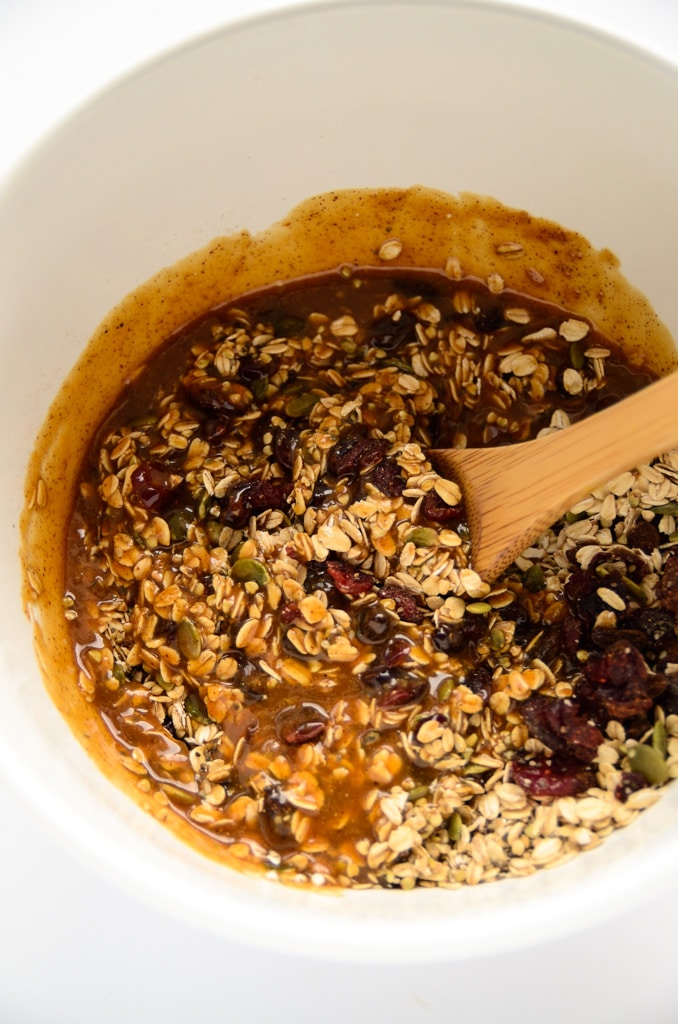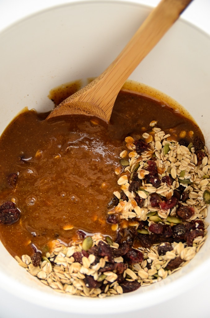 - Pour the almond butter mixture over the dry ingredients and gently stir together.