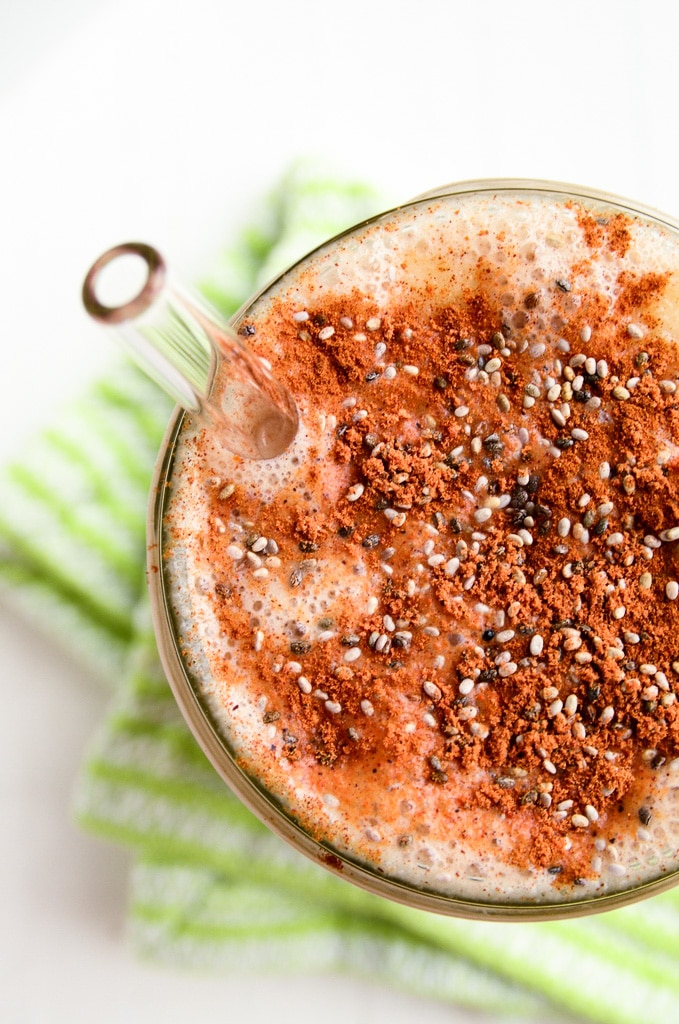 To make it, you'll simply toss a frozen banana or two, a peeled apple, almond milk, almond butter, cinnamon, and nutmeg into a blender. After blending to perfection in a quick minute, you'll pour this apple-cinnamon smoothie into a glass, and sprinkle with the toppings that suit your fancy. Chia seeds and cinnamon suited my fancy on the day I photographed this recipe, so there you have it.