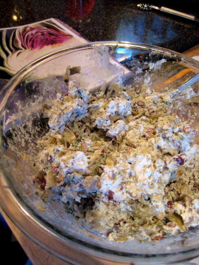 1. In a bowl, mash the goat cheese until creamy. Add the parmesan, diced artichokes, pine nuts, and basil; season with sea salt and black pepper to taste.