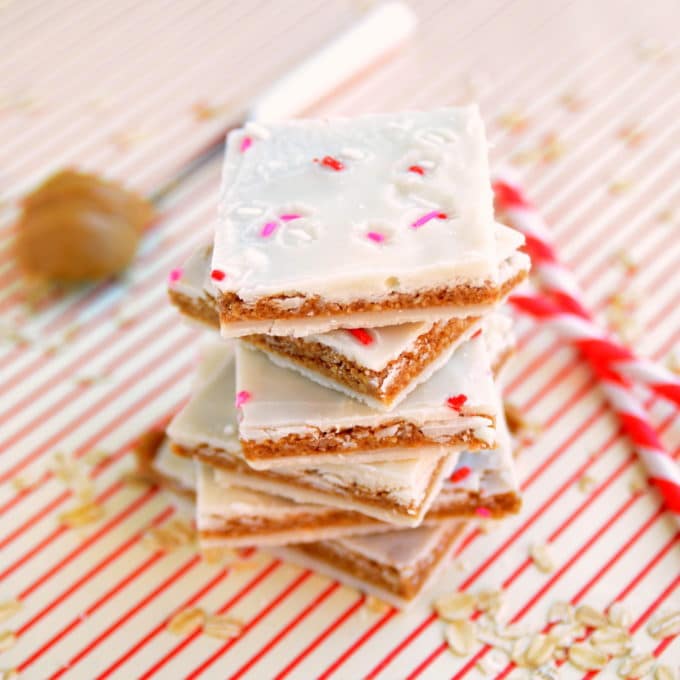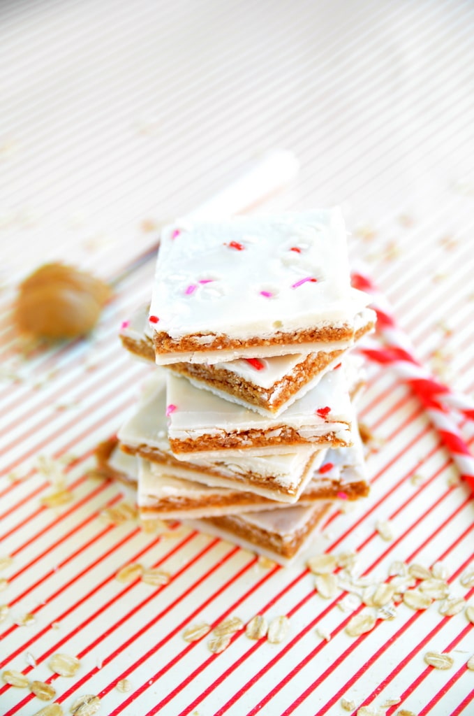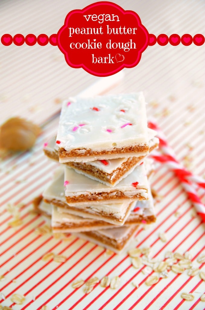 And because I can't personally hug/thank each and every one of you, I hope this recipe makes it to your kitchen and does the thanking for me. Since you all seem to enjoy these Vegan + Gluten-Free Peanut Butter Cookies so much, I thought I would do a no-bake bark that incorporated much of their peanut buttery goodness. Thus, I give you Peanut Butter Cookie Dough Bark. Vegan and gluten-free peanut butter cookie dough is slathered between two layers of coconut butter and topped with sprinkles. The result is dangerously tasty but you need not worry about eating several pieces in a sitting because this treat is filled with healthy fats, fiber, and amazingness. The coconut butter acts just as white chocolate would, nestling the cookie dough between melt-in-your-mouth layers. The bark has this addictive and subtle *snap* when biting in that will keep you coming back for more... and more. If you can stand to give them away, these are the perfect treats to make for your loved ones on Valentine's Day. However, I recommend using the "one for me, one for you" rule with this one because you will end up very, very sad if you don't save some for yourself!