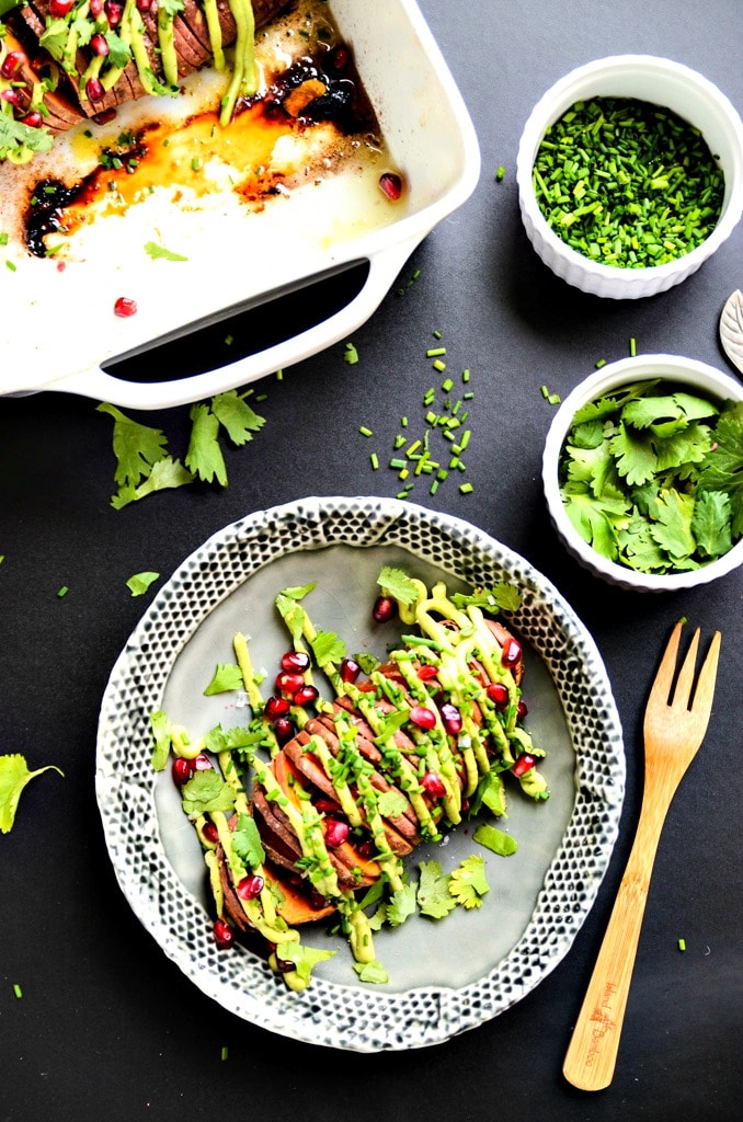 Tender sweet potato slices drizzled with garlicky avocado aioli and sprinkled with pomegranate seeds, cilantro leaves, and fresh chives. It doesn't get much simpler or tastier than this dish.