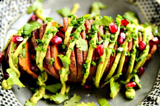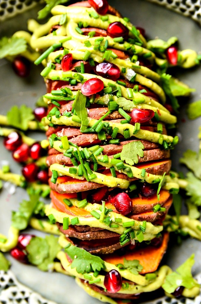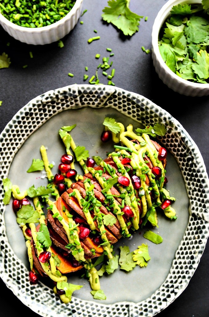 - Transfer each sweet potato to a plate. Pipe or dollop the avocado aioli on top of the sweet potatoes and sprinkle with pomegranate seeds, cilantro leaves, chives, and sea salt. Serve immediately.