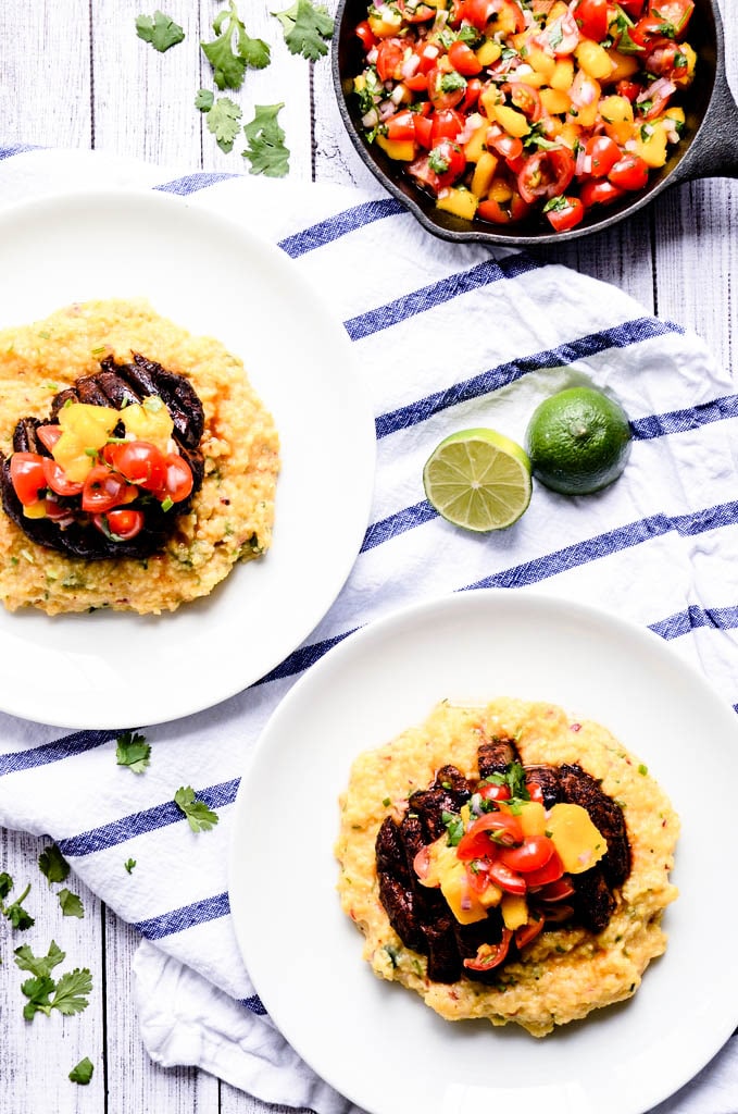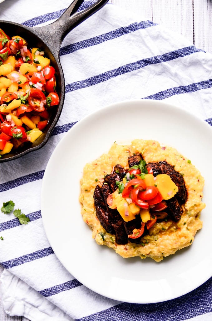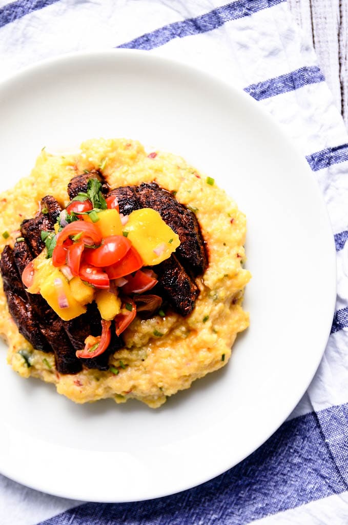 This vegan smoky chipotle polenta with spiced portobellos is a spicy, summery dream. Smoked poblano and chipotle peppers are woven throughout an ultra creamy polenta that gets topped with spiced portobellos and a sweet 'n' tangy mango salsa.