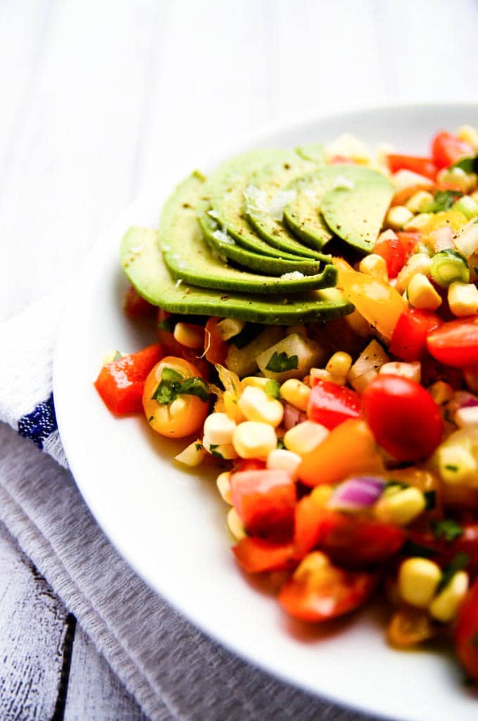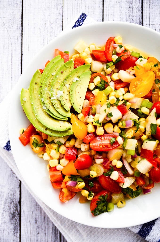 This vegan late spring vegetable ceviche is made with juicy grape tomatoes, fresh corn, crisp jicama, red pepper, silky mango, zesty red onion, and scallions. The mixture soaks for 2 to 3 hours in a citrus vinaigrette made with lime juice, orange juice, cilantro, serrano peppers, olive oil, and salt. As it marinates, the vegetables soften and become infused with the flavors from the vinaigrette. The result is a salad that looks like confetti and tastes like summer. The jicama adds this amazing crunch and the mango adds just a touch of sweetness to balance the citrus. The perfect summer side!
