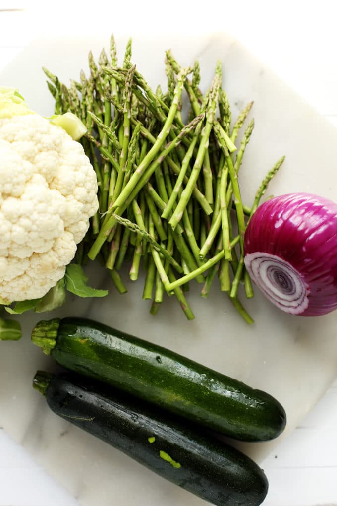 - Line a large baking pan with parchment paper. Spread the veggies out over the pan, drizzle with the oil, and season with salt and pepper. Roast for 45 minutes or until veggies are tender and golden, stopping to toss at the 20-minute mark.