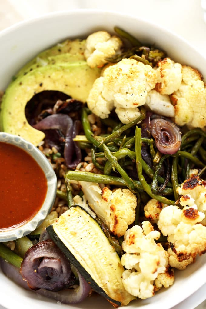 - Scoop 1 cup of the brown rice into a bowl, top with the roasted vegetables. If your barbecue sauce is thick, whisk one tablespoon of water into it at a time until desired thinness is achieved. Drizzle over the veggies or serve in a small dish alongside them. Garnish with the sliced avocado.