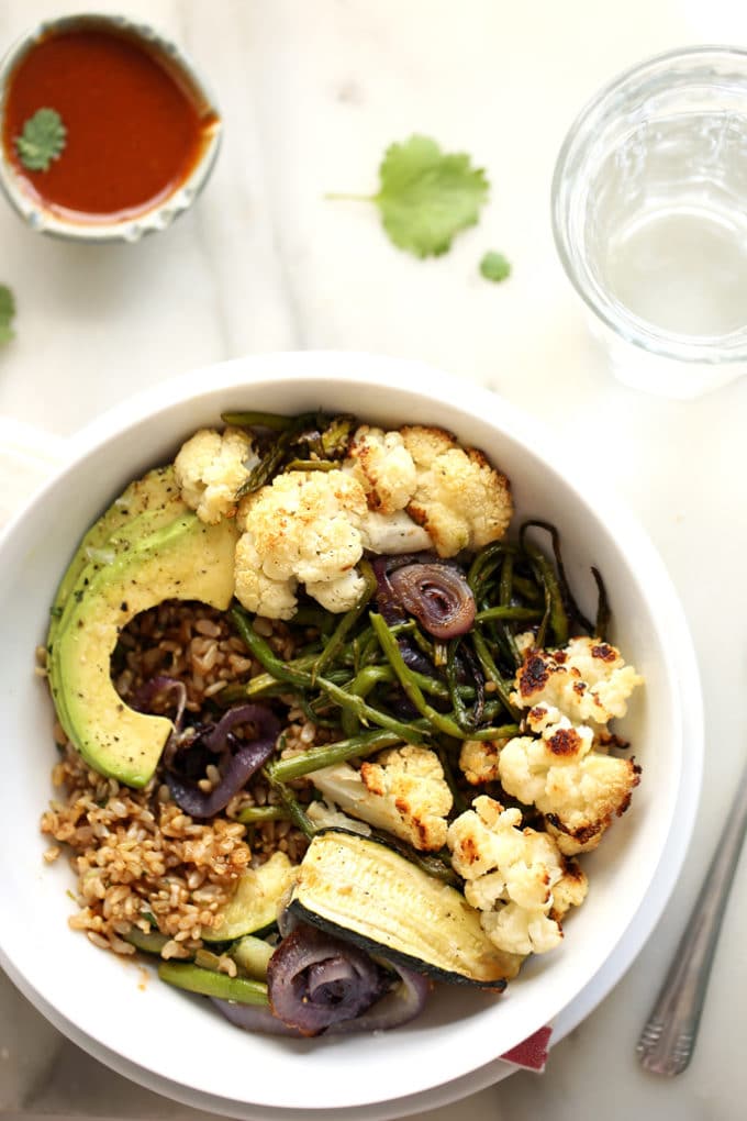 This roasted vegetable rainbow bowl gets a comforting, grill-weather twist with the addition of balsamic-splashed brown rice, tangy maple barbecue sauce, and sliced avocado. A little sweet, a little tang, a little smokiness, and just enough buttery avocado to bring balance to this addictive meal.
