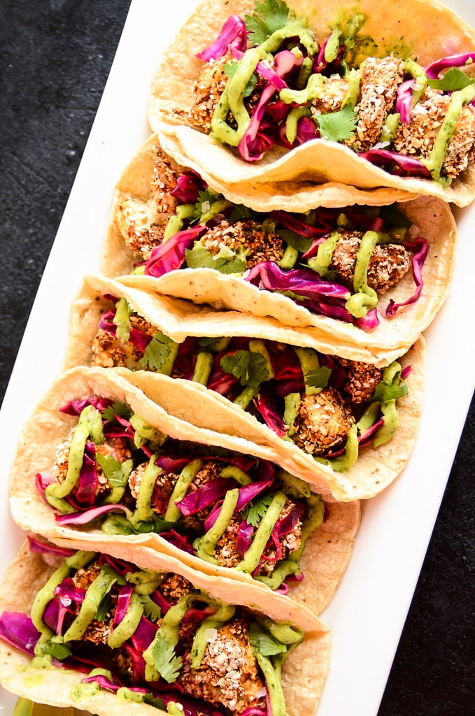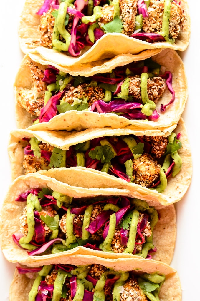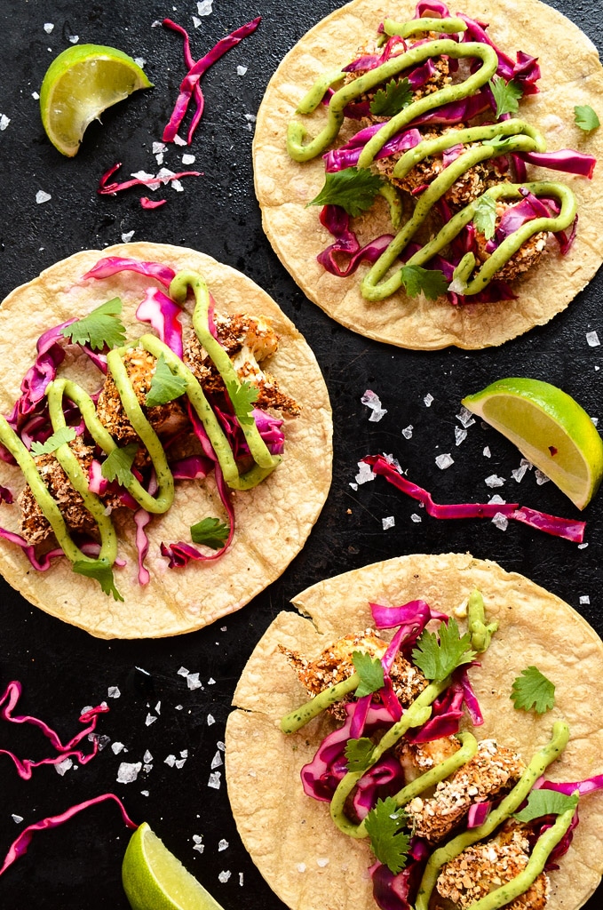 Bite-size cauliflower florets are coated in an almond milk and brown rice flour batter, tossed in a mixture of coarsely ground oats + spices, and baked in the oven until they're golden, crunchy, and packed with flavor. While the outside of the cauliflower crisps up, the inside becomes tender and moist <-- note: this word makes me slightly uncomfortable but there's really no better way to describe the texture. Then, the cauliflower bites are nestled in warm corn tortillas, topped with a tangy purple cabbage slaw, and drizzled with avocado cream. The final touch is a splash of fresh lime juice, and then it's time to bite, savor, and repeat.
