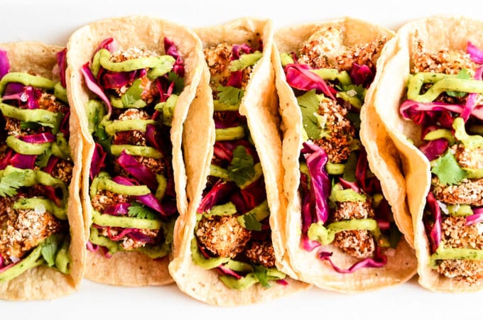These vegan, gluten-free crispy cauliflower tacos with slaw & avocado cream are the perfect balance of crunchy, tender, and juicy. Bite-size cauliflower florets are coated in an almond milk and brown rice flour batter, tossed in a mixture of coarsely ground oats + flavorful spices, and baked in the oven until crisp and golden. Then, they're nestled in warm corn tortillas, topped with a tangy purple cabbage slaw, and drizzled with avocado cream. The final touch is a splash of fresh lime juice, and then it's time to bite, savor, and repeat.