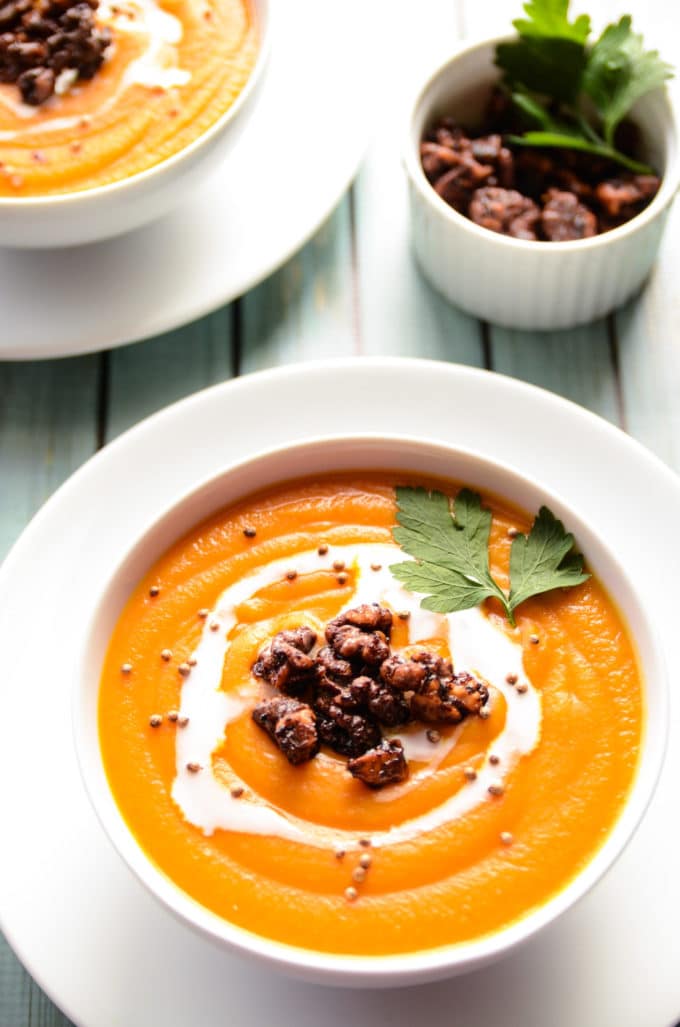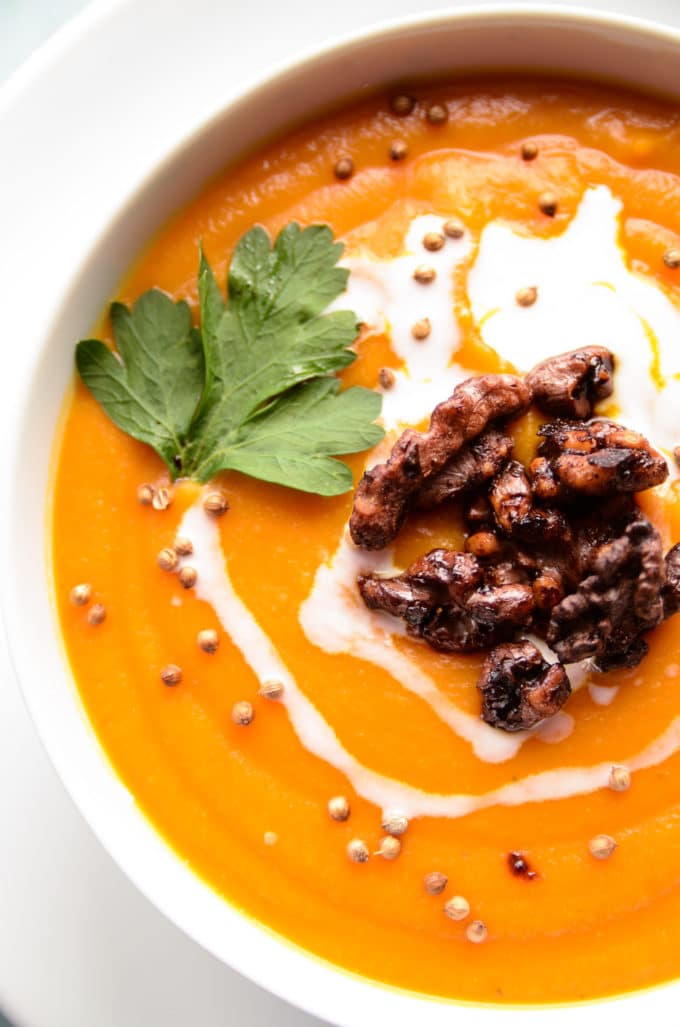 This vegan and gluten-free carrot, lentil & squash soup with walnut croutons exemplifies the late summer to early fall shift. Its bright orange hue, warm spices, and creamy richness are the perfect combination for a time of transition.Â