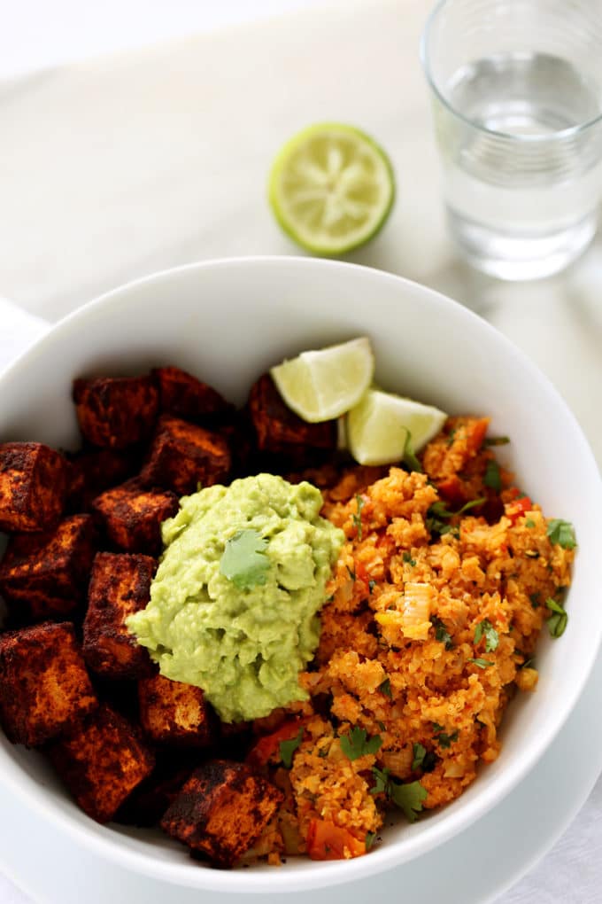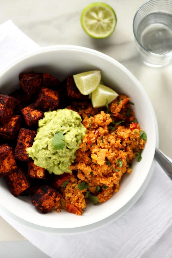 Spicy Cauliflower Rice, Cinnamon-Paprika Sweet Potatoes & Avocado Mash