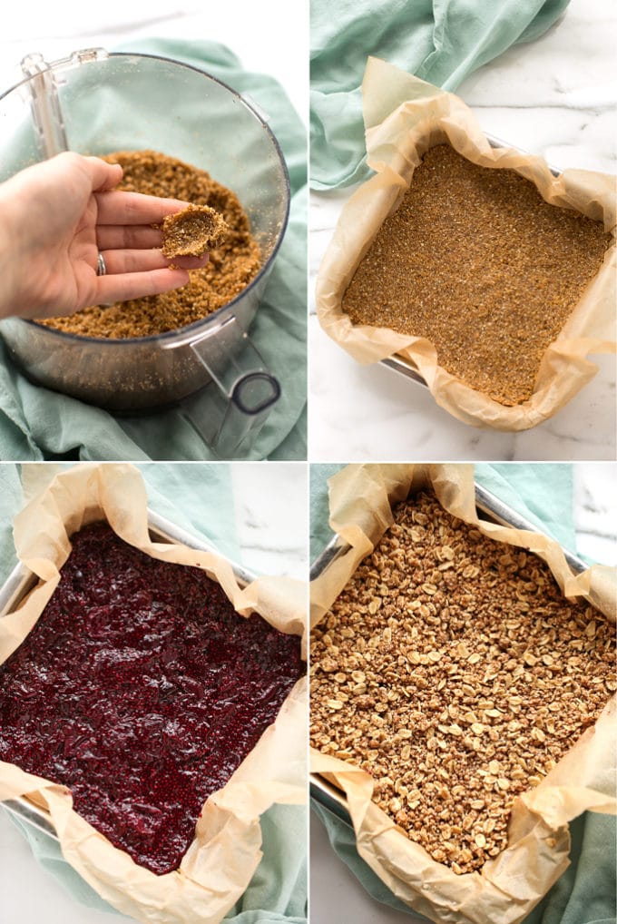 To review, you'll make the crust, press the crust into a pan, chill the crust to set, make the cherry chia filling and crumble topping, spread the filling over the crust, and sprinkle on the oat topping.