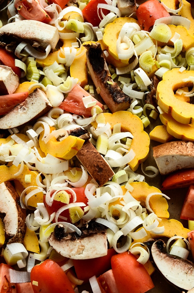 - Line a baking pan with parchment paper. Spread the squash, tomatoes, mushrooms, and leeks out across the pan. Drizzle with the olive oil, and sprinkle with salt and pepper.