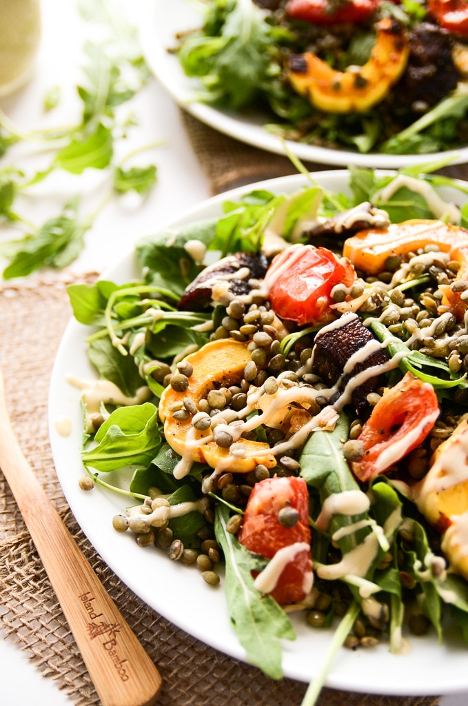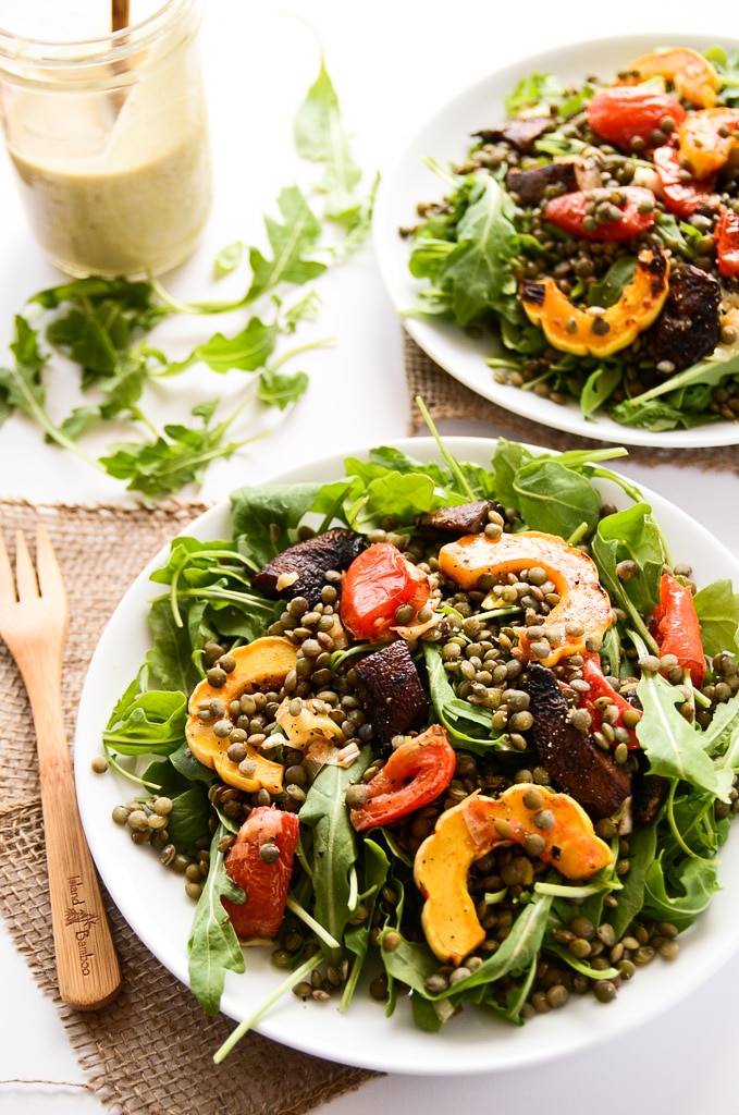 This vegan french lentil & roasted vegetable salad with creamy tahini dressing has four delectable layers. AÂ bed of baby arugula is topped with protein-packed french lentils, roasted delicata squash and other savory veggies are strewn about the greens, and the most delightfully creamy tahini dressing is drizzled over top.Â