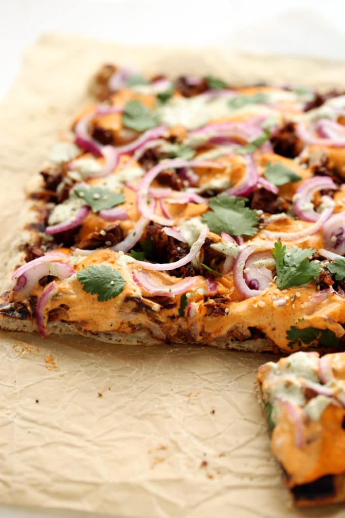Grilled Vegan BBQ Jackfruit Pizza with Hemp Seed Cheddar