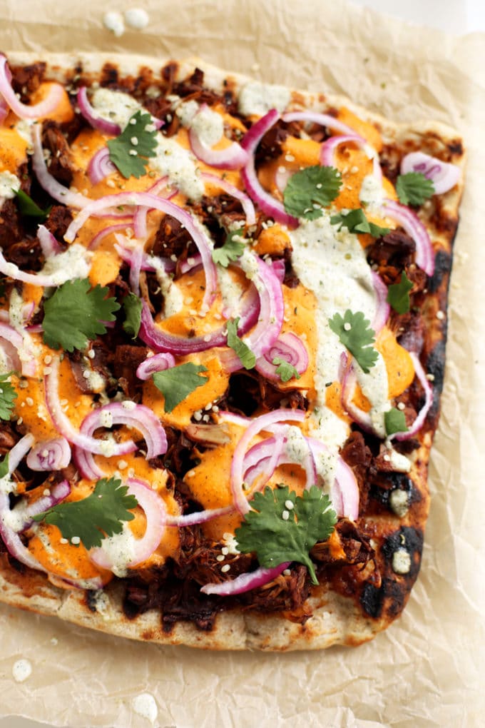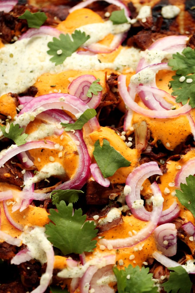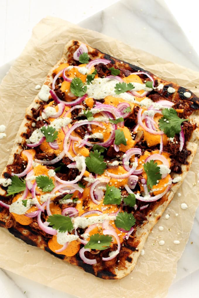 Once you have the toppings ready to go, it's time to grill. Heat your grill over high, roll out your pizza dough (I use store-bought, but you can certainly make your own), brush it with olive oil, and slide it onto the grill. The dough cooks up quickly, so in just a few minutes, you'll want to flip it over and start topping. Brush the top of the pizza with BBQ sauce (I recommend making this one if you have 10 minutes to spare), spread the BBQ jackfruit over the sauce, dollop on the hemp seed cheddar, and sprinkle on the red onions. Close the grill and cook for another handful of minutes or until the bottom of the crust has nice grill marks and the toppings are warm and the onions are slightly wilted.