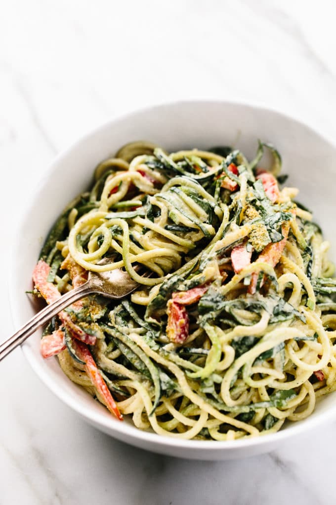 Nestle heaps of the zucchini pasta into bowls and sprinkle with a bit of vegan parmesan cheese, if you'd like. Then, sink a fork in and get twirling.