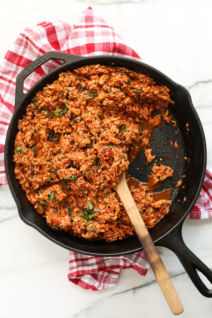- Heat a large skillet over medium heat. Once the pan is hot, add the riced cauliflower, crushed tomatoes, roasted red peppers, giardiniera, balsamic vinegar, capers, garlic, dried basil, oregano, and red pepper flakes. Cook for 15 minutes or until the cauliflower is tender, stirring occasionally. Then, add in the baby spinach and cook another 8 to 10 minutes or until most of the liquid has cooked off, stirring frequently. Add the sea salt and adjust seasoning according to taste preferences. If you added the giardiniera and capers, ¼ teaspoon of salt will likely be plenty; however, if you skipped on one or both, I suggest adding more to season it properly.