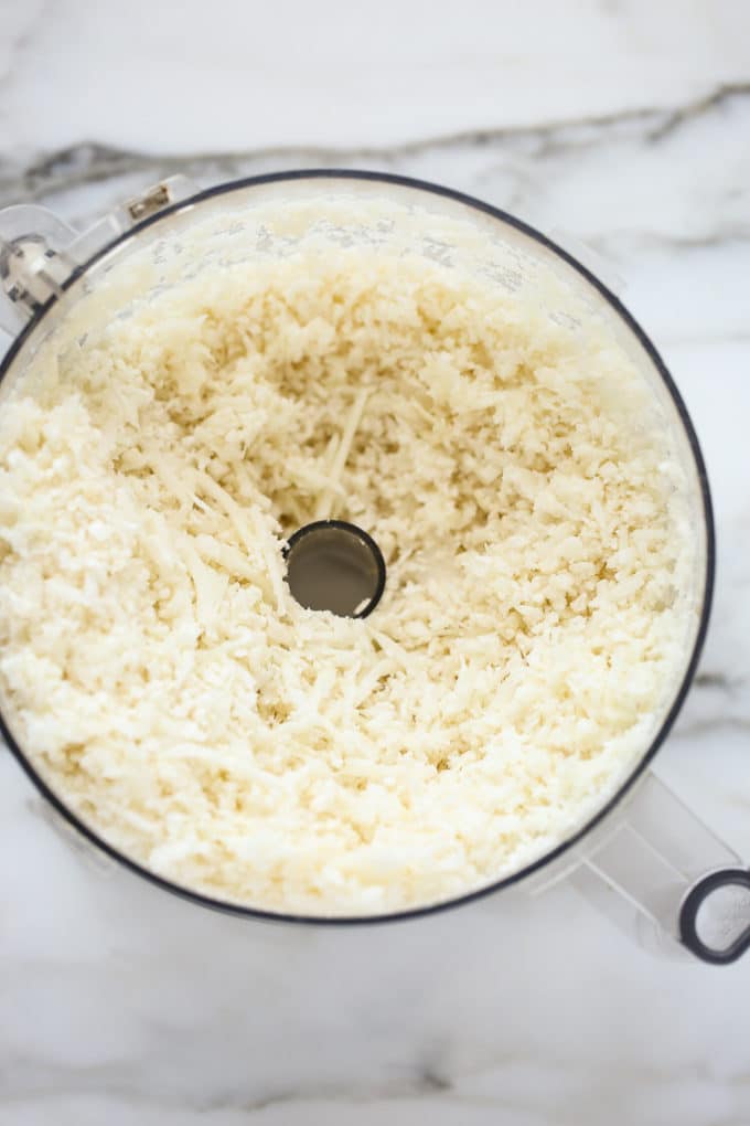 - Rice the cauliflower florets by either processing in a food processor with a grater attachment, pulsing in a food processor with a s-blade, or grating by hand with a grater. If you pulse it in the food processor, you'll want to divide it into two batches so that it evenly processes. You want rice-sized pieces.