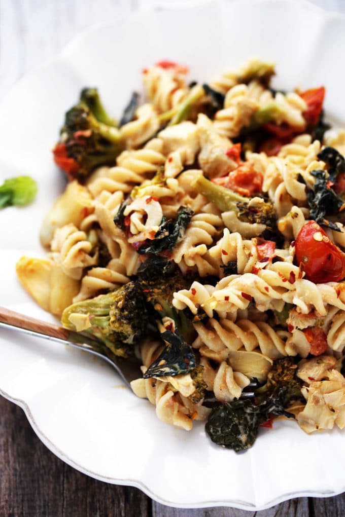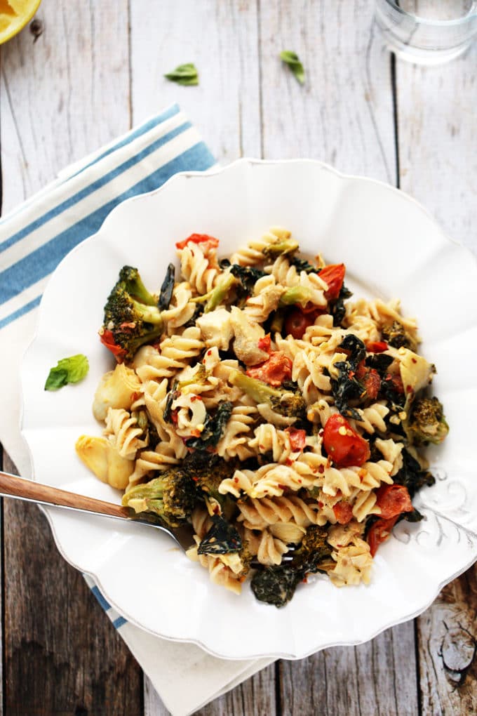 You'll start by throwing fresh broccoli florets, cherry tomatoes, and lacinato kale (a milder member of the kale family) into a pan with a bit of olive oil. However, this recipe is about flexibility rather than precision, so you can actually toss any veggies you prefer into the pan. Cook that mixture for about 20 minutes or until tender, and then stir in the quartered artichoke hearts to warm them throughout. While the veggies are sautéing, get your pasta cooking. I like to use brown rice rotini for this dish but you could also use fusilli, rigatoni, penne, etc.