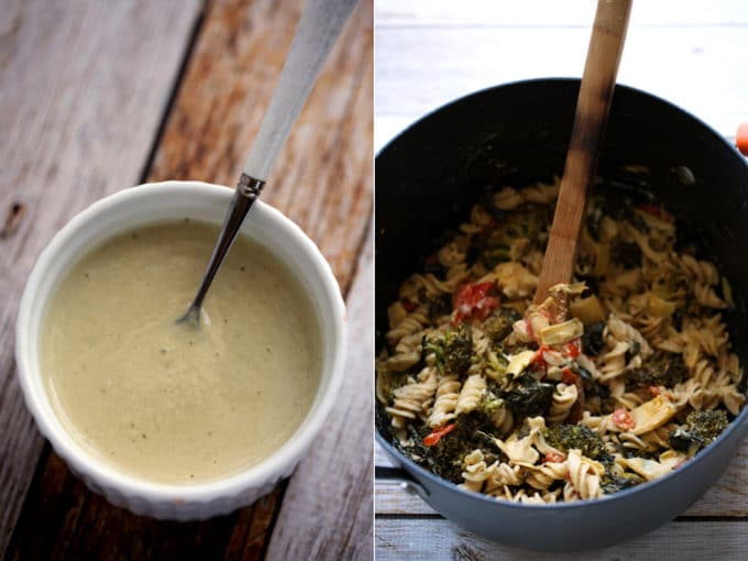 - Pour the sunflower seed alfredo over the pasta and toss to coat. Add in a small amount of the reserved pasta water to loosen the sauce if needed. Add the cooked vegetables, and gently stir to incorporate.