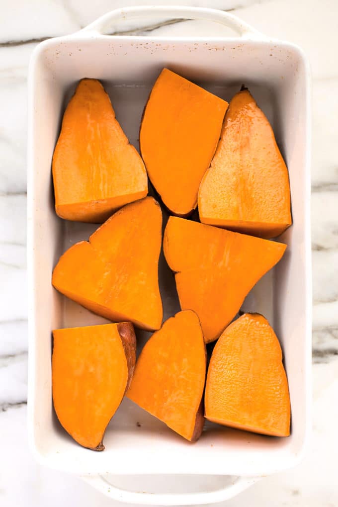 - Lightly brush the fleshy side of each sweet potato with the melted coconut oil and place, flesh side up, in a large rectangular baking dish (they should be quite snug next to one another).