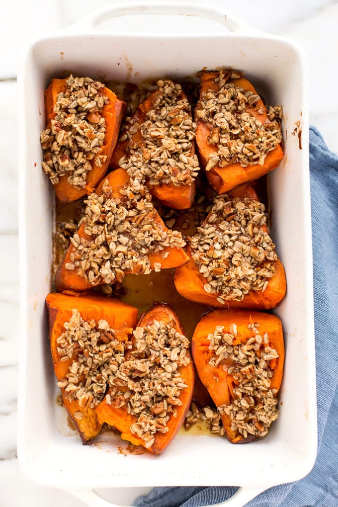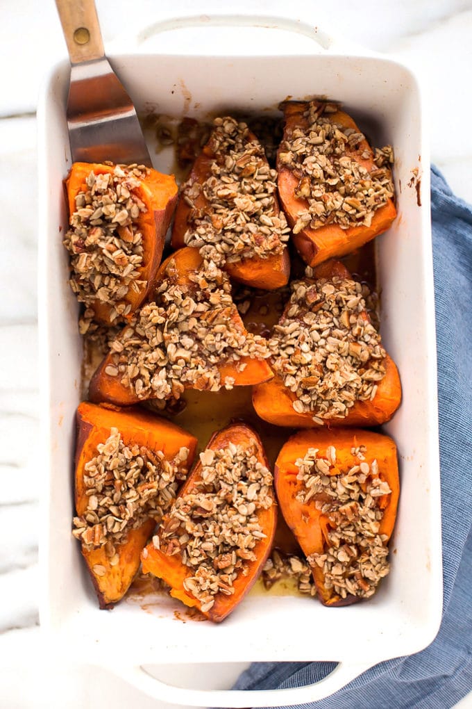 These vegan baked sweet potatoes with sunflower-pecan crumble make an excellent (and easy) holiday side dish. Tender roasted sweet potatoes are topped with crunchy sunflower-pecan crumble. This holiday-appropriate side requires just 10 minutes of active kitchen preparation. You read that correctly: 10 MINUTES!