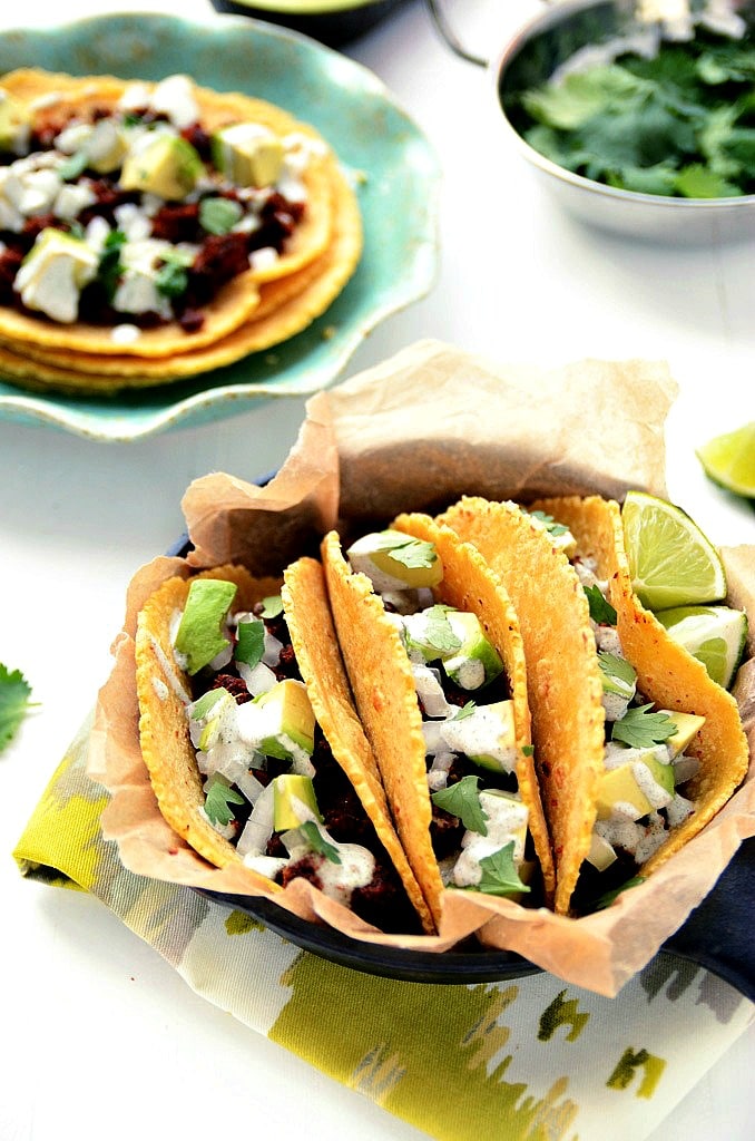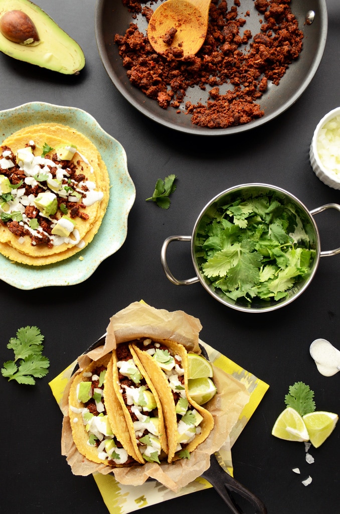 - Scoop the "chorizo" into the tortillas, top with onion, avocado, cilantro leaves, hemp seed sour cream, and a spritz of fresh lime juice.